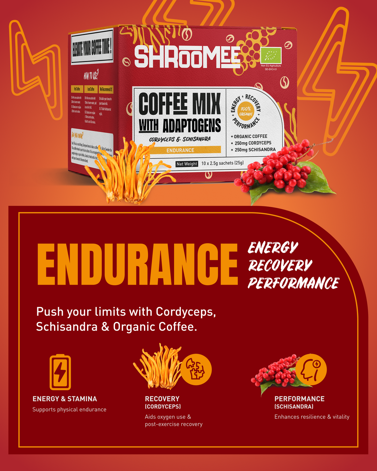 A bold organic instant coffee blended with Cordyceps and Schisandra. Endurance supports energy, recovery, and performance — helping you stay strong from start to finish.