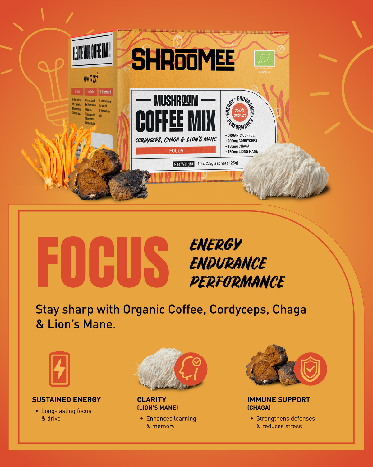 A rich organic instant coffee blended with Cordyceps, Lion’s Mane and Chaga. Wake Up gives you the focus of coffee with a grounded, balanced twist.