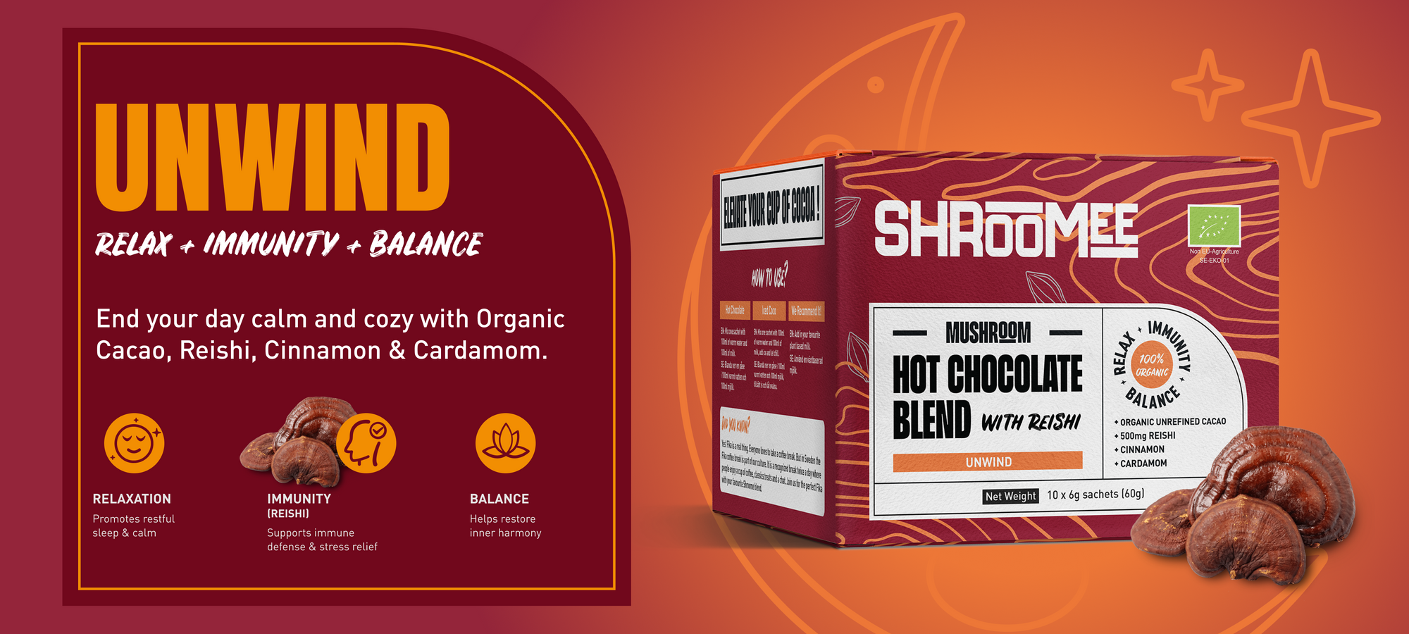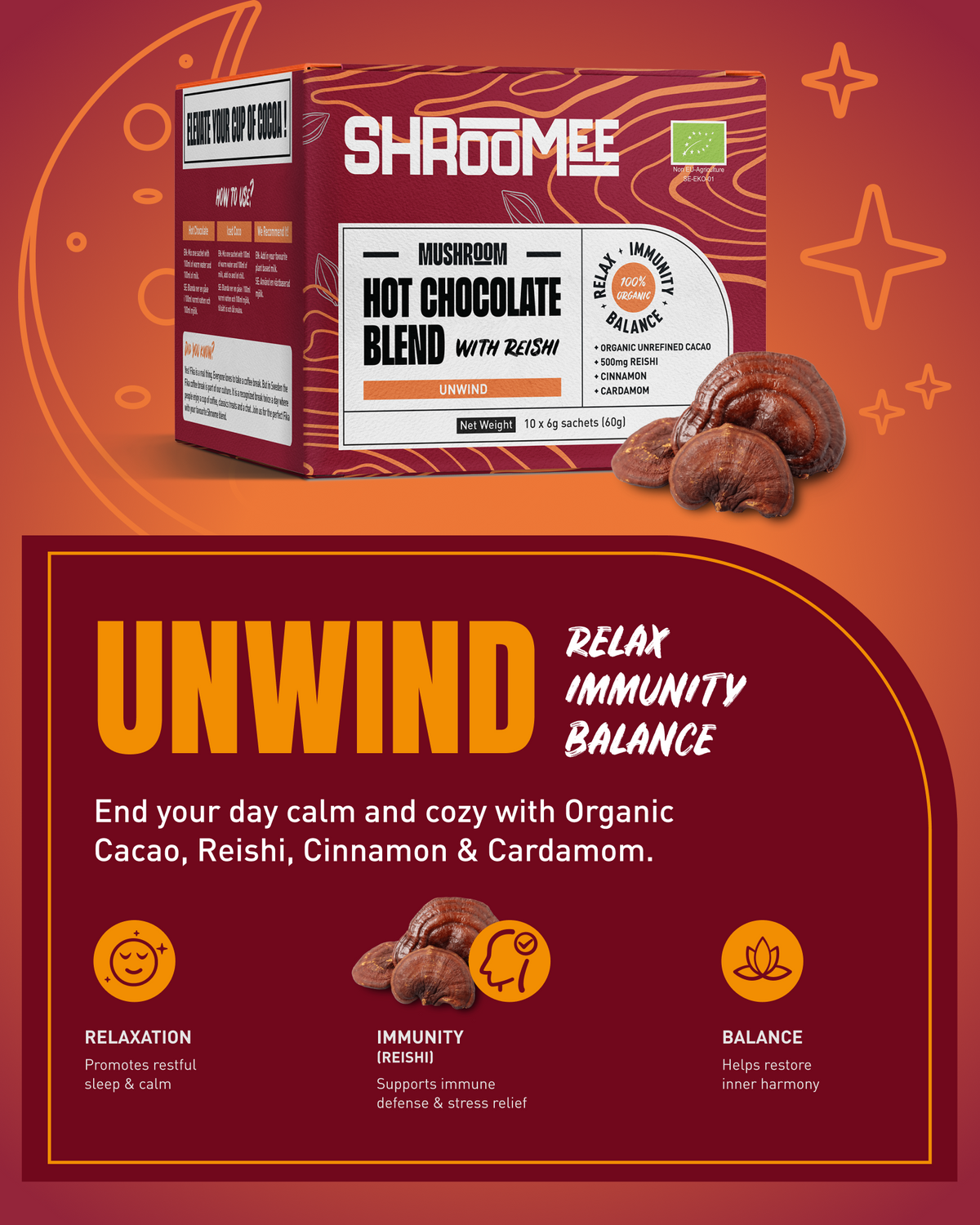 Cozy up with Shroomee Hot Chocolate Blend with Reishi – a comforting, organic drink that blends unrefined cacao, Reishi mushroom, and warming spices like cinnamon and cardamom. Designed for those moments when you want to slow down, it’s a rich, soothing take on a timeless favorite.